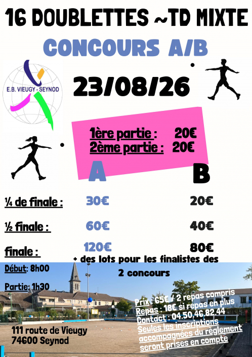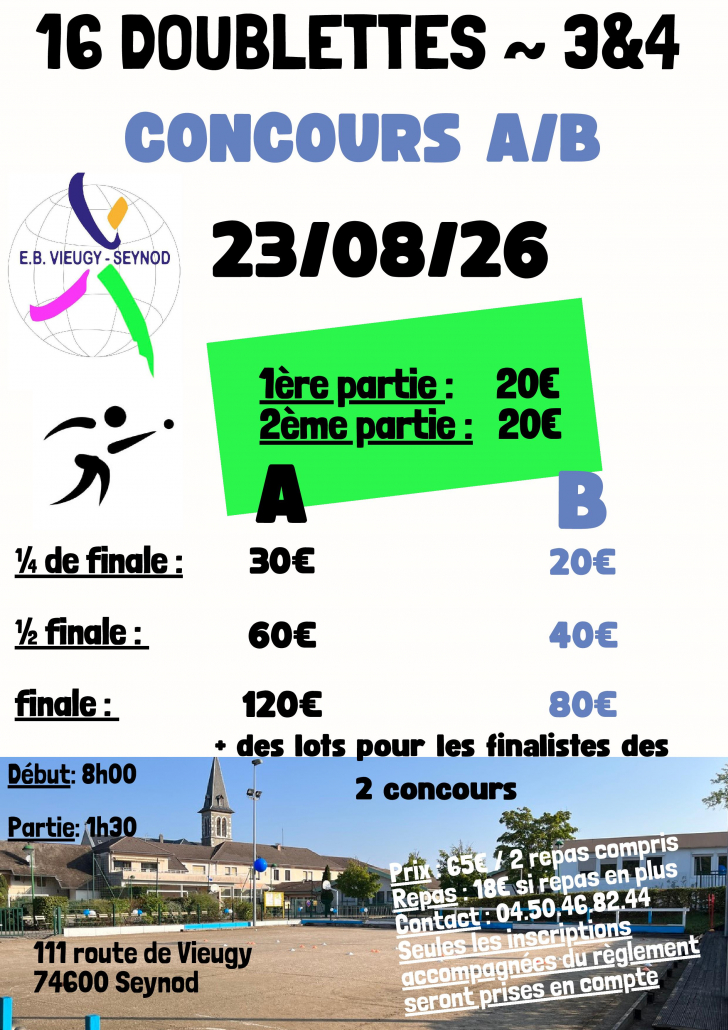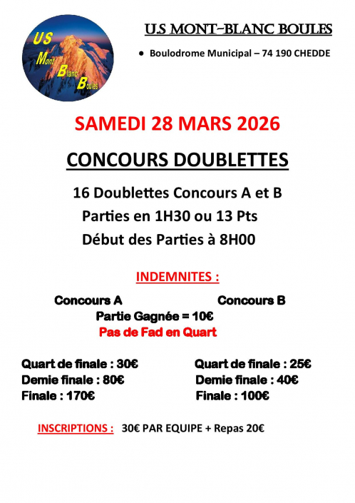 Une mise au point concernant les indemnités concours = que vous organisiez un concours par poules , par groupes , A et B , système Aurard ou Bol d’Or , le montant des indemnités doit correspondre au montant total des inscriptions multiplié par le coefficient 1.8 ( exemple 16 quadrettes inscriptions 50 euros = 800 euros , montant total des indemnités 800 X 1.8 = 1440 euros minimum). Le CBD 74 constate que certains clubs n’appliquent pas cette règle , parfois même de façon exagérée , c’est pourquoi il va veiller à faire respecter ce point de règlement.