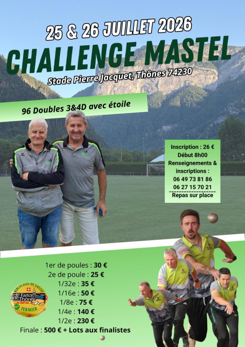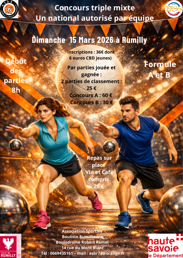 Faute de boulodrome disponible , les équipes suivantes joueront à Thonon le samedi 21 mars 2026 à 8 heures : Messier , Girel , Capdessus , Perrier , Bosson , Hudry , Bouvier , Saint-Pierre , Barthel , Falconnet , Buat , Collado.