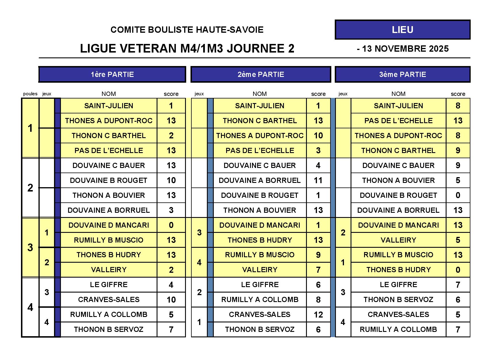 13/11/2025 – LIGUE VETERAN RESULTATS 2EME JOURNEE ET CLASSEMENT