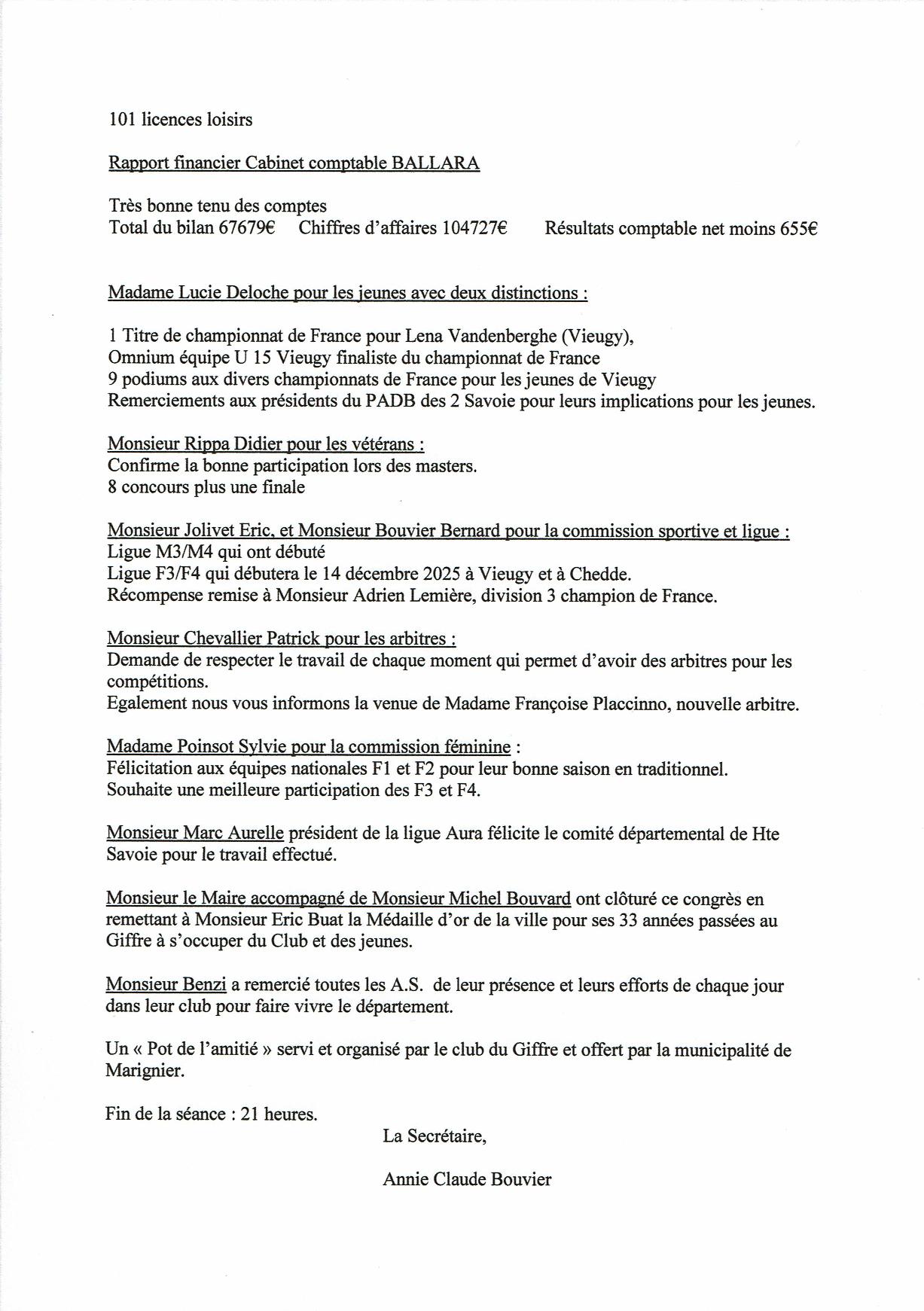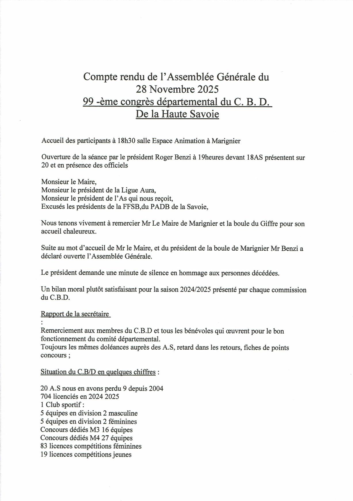 La 99ème Assemblée Générale du Comité Bouliste de Haute-Savoie s’est tenue à l’Espace d’Animation à Marignier (Organisation Boule du Giffre) ce vendredi 28 novembre 2025. Le maire de Marignier , Christophe Péry , était présent. Il a souhaité la bienvenue aux boulistes haut-savoyards. Après la minute de silence en mémoire des boulistes disparus cette année , Roger Benzi , président du CBD 74 , a ensuite ouvert la séance puis passé la parole à Annie-Claude Bouvier la Secrétaire. Ensuite les différentes commissions ont présenté leur rapport , Lucie Deloche pour les jeunes , Didier Rippa pour les vétérans , Eric Jolivet et Bernard Bouvier pour la commission sportive et les ligues , Patrick Chevallier pour l’arbitrage , et Annie-Claude pour les féminines en l’absence de Sylvie Poinsot-Berthelot.