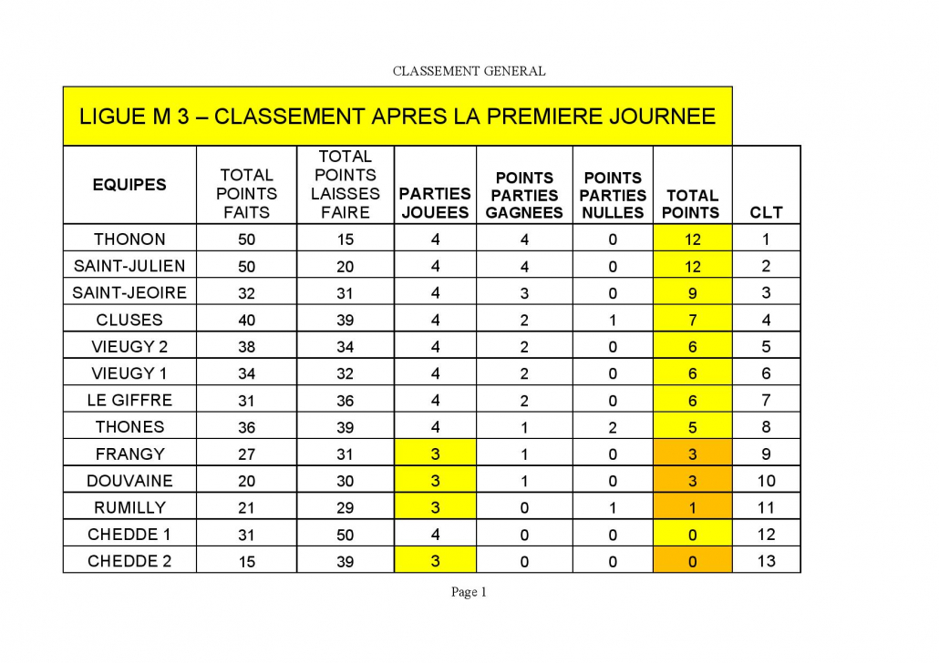LIGUE M3 PREMIERE JOURNEE ET CLASSEMENT