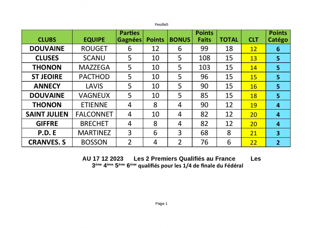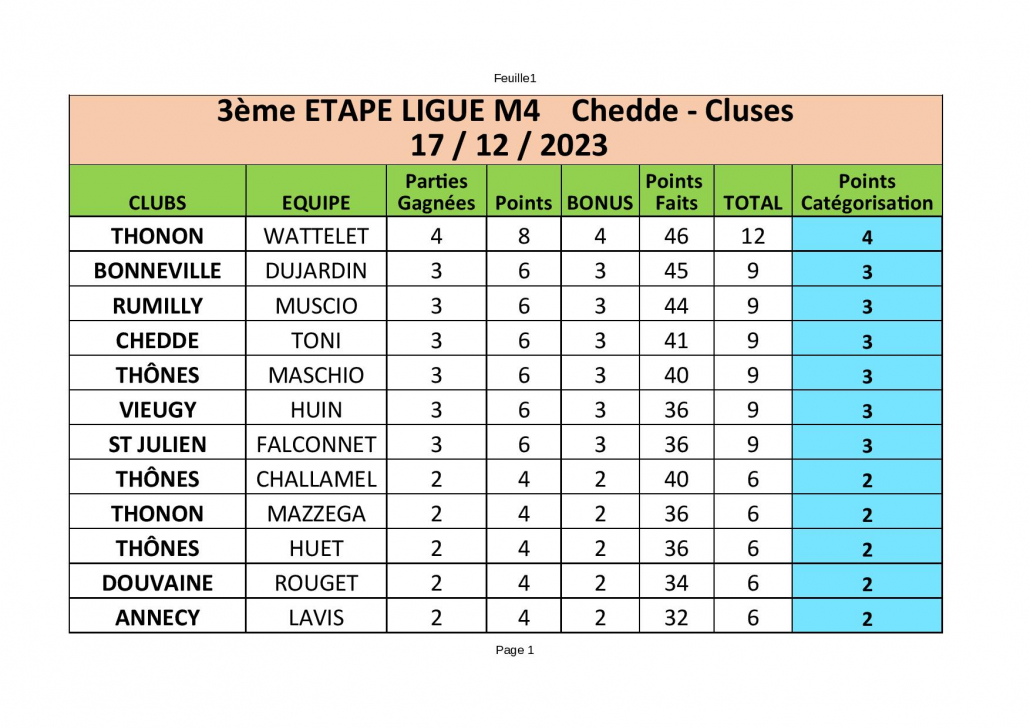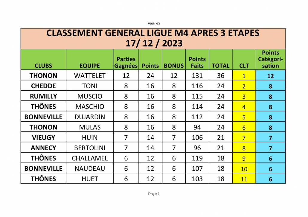 La troisième journée de la Ligue M4 s’est jouée ce week-end (17 décembre 2023) et a vu l’équipe Wattelet de Thonon remporter à nouveau ses 4 parties. Au classement général après les trois premières journées , cette équipe ( 12 parties gagnées) devance l’équipe Toni de Chedde.